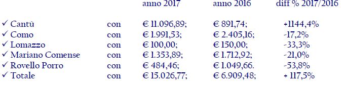 Sull’altra sponda del Lario è grazie al comune di Cantù se si registra un incremento in Provincia di Como della riscossione nell’anno 2017 (+117,5%) rispetto all’anno 2016. In provincia di Como infatti hanno contribuito al contrasto all’evasione fiscale nell’anno 2017 solo 5 comuni su 149 totali (3,36%), mentre nel 2016 erano 8