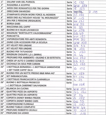I premi saranno da ritirare entro e non oltre 30 giorni presso la panetteria Saldarini, piazza Carozzi.