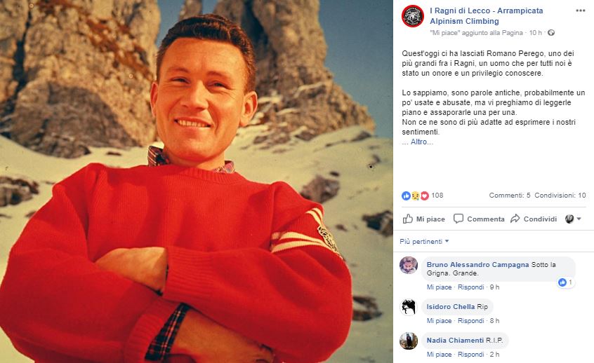 “Ci ha lasciato Romano Perego uno dei più grandi fra i Ragni, un uomo che per tutti noi è stato un onore e un privilegio conoscere – hanno scritto i Maglioni Rossi sulla pagina fb del gruppo. ” Lo sappiamo, sono parole antiche, probabilmente un po’ usate e abusate, ma vi preghiamo di leggerle piano e assaporarle una per una. Non ce ne sono di più adatte ad esprimere i nostri sentimenti”.