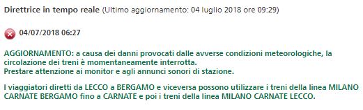 Bloccata la linea ferroviaria Lecco – Bergamo a causa del maltempo.