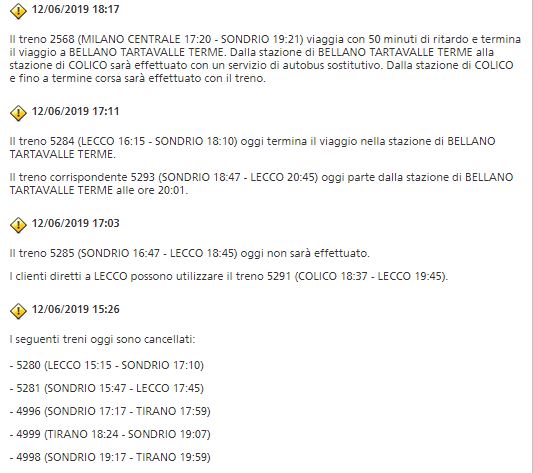 AGGIORNAMENTO E’ ripresa alle 19.00 la circolazione dei treni con riduzione precauzionale della velocità fra Dervio e Bellano, linea Lecco-Tirano/Chiavenna, sospesa dalle ore 10.15 di questa mattina per le abbondanti precipitazioni che si sono abbattute in Valtellina. Coinvolti 34 treni regionali: 13 limitati nel percorso e 21 cancellati. I tecnici di Rete Ferroviaria Italiana (Gruppo FS Italiane) hanno monitorato l’evolversi della situazione, con personale dedicato all’emergenza, per l’intera durata dell’interruzione. Non pochi i disagi subiti dai pendolari, costretti a viaggiare pigiati, e a volte seduti anche per terra, sui bus sostitutivi Ma fortunatamente la situazione sta tornando lentamente alla normalità