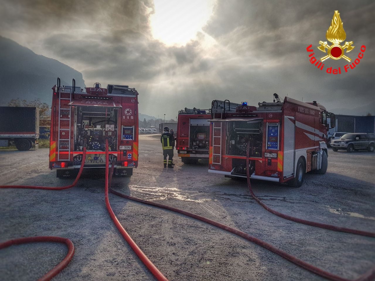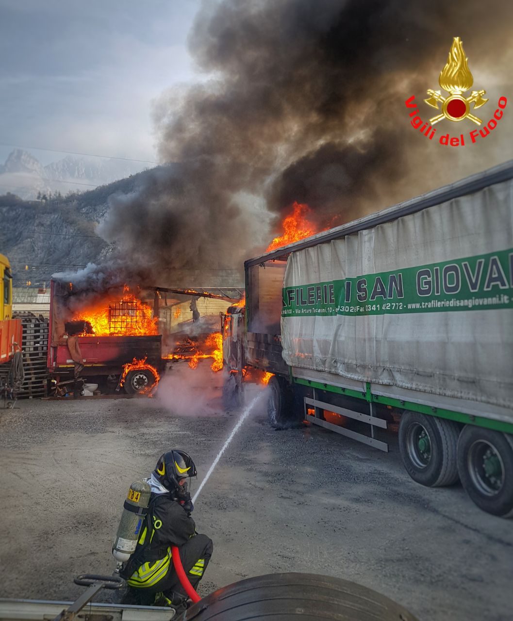 E’ in corso un maxi intervento dei Vigili del Fuoco del comando di Lecco nel deposito camion adiacente all’interporto del Bione.