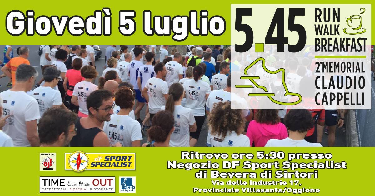 Memorial Cappelli: corsa e colazione di prima mattina. Il Memorial Claudio Cappelli è giunto alla sua seconda edizione. Giovedì 5 luglio si terrà la 5.45 Run Walk Breakfast con partenza all’alba: il ritrovo è fissato per le ore 5.30 presso il parcheggio del negozio DF Sport Specialist di Bevera di Sirtori in via delle Industrie 17. La partenza è prevista appunto per le 5.45.