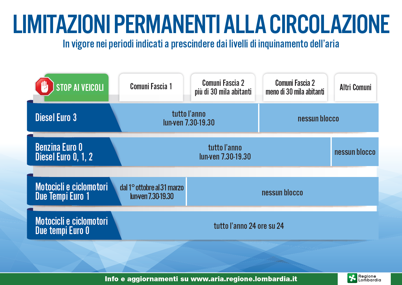 Dal 1° ottobre 2019 sono vigenti, ed estese a tutto l’anno, le limitazioni per i veicoli Euro 3 diesel, in aggiunta alle limitazioni già attive negli anni passati per i veicoli diesel fino a Euro 2 e benzina Euro 0.