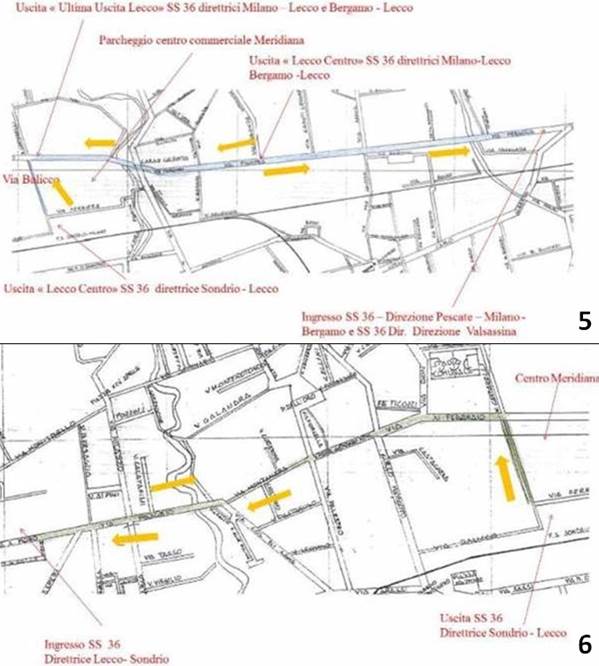 Le direttici Milano- Lecco / Bergamo – Lecco/ Valsassina – Lecco: i veicoli in arrivo a Lecco dagli sbocchi della SS 36 su via Balicco potranno parcheggiare nelle aree di sosta ivi esistenti, per riprendere la SS 36 dovranno percorrere via XI Febbraio, largo Caleotto, via Marconi, via Fiandra e via Pergola, fino rampa di accesso alla SS 36 direzione Milano – Pescate e alla SS 36 Dir direzione Valsassina. Per riprendere la direttrice Lecco – Sondrio dovrà invece essere seguito il percorso riportato nella mappa 5.