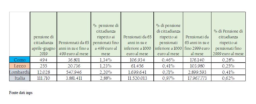 “Analizzando i dati dell’INPS relativi alle pensioni di Cittadinanza accolte da aprile a giugno 2019 e confrontandoli con la situazione dei pensionati in essere sul territorio della Provincia di Lecco suddivisi per fascia economica si rileva l’inadeguatezza dello strumento a dare risposta ad una situazione di difficoltà economica vissuta da molti Pensionati” sottolinea Arrigoni. “Infatti, a fronte di 20.736 pensionati in Provincia di Lecco, di età superiore ai 65 anni, che hanno una pensione inferiore a 500 Eeuro mensili, sono solo 255, pari all’1,23%, coloro che hanno beneficiato dell’integrazione della Pensione di Cittadinanza”.