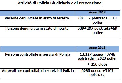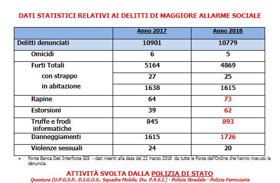 Guardando ai dati dal raffronto tra il 2017 e il 2018 emerge che il numero complessivo dei reati denunciati risulta pressoché costante, mentre aumentano gli arresti operati dalla Polizia di Stato, le persone e le auto controllate.