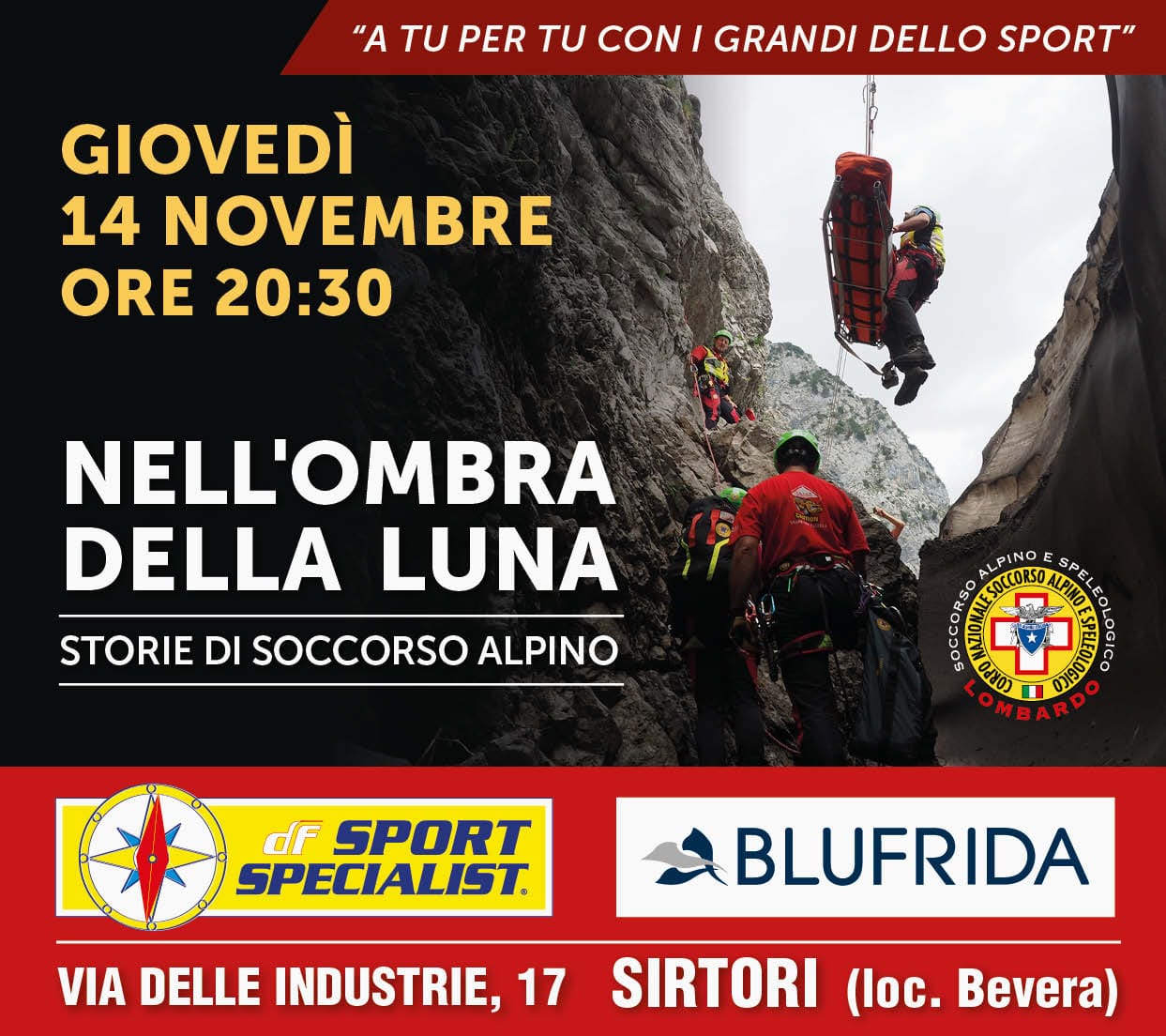 La serata inizierà alle ore 20.30 presso il negozio DF Sport Specialist di Bevera di Sirtori (LC): al termine, buffet offerto al pubblico durante il quale sarà possibile fare domande e colloquiare con i membri del soccorso alpino.
