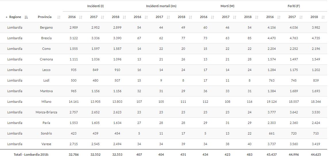 Veicoli coinvolti per categoria, per regione e provincia – Lombardia 2018