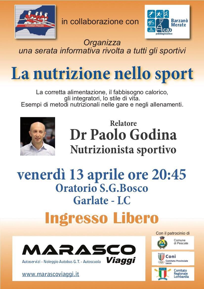 I Canottieri di Pescate e Cab Polidiagnostico organizzano un appuntamento intitolato “La nutrizione nello sport”. Venerdì sera alle 20.45 all’oratorio S.G. Bosco di Garlate il dottor Paolo Godina, nutrizionista sportivo, parlerà di corretta alimentazione, di fabbisogno calorico, di integratori, di stile di vita. Lo specialista porterà esempi di metodi nutrizionali nelle gare e negli allenamenti. L’evento è realizzato con il patrocinio del Comune di Pescate, Coni Comitato Provinciale di Lecco e il Fic comitato regionale Lombardia.