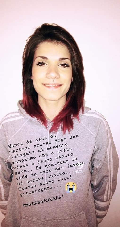 Ricordiamo infatti che per l’appello ritrovare la giovane scomparsa arriva da Molteno, in provincia di Lecco, ma al confine con la zona dell’Erbese. Maria manca da casa da martedì scorso, dopo un litigio, e la sua famiglia la cerca disperatamente. L’ultima volta pare sia stata avvistata a Lecco sabato sera, poi più nulla.
