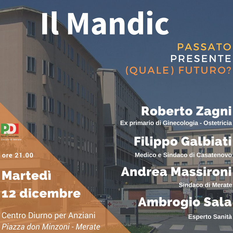 Ospedale di Merate: domani, 12 dicembre si parlerà del passato, del presente e soprattutto del futuro del Mandic. Ad organizare l’incontro, che avrà luogo alle 21 al centro diurno per anziani di Merate (in piazza Don Minzoni) è il Partito Democratico di Merate.