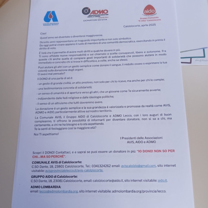 Presenti in sala anche i rappresentanti di Avis e Aido che hanno consegnato ai ragazzi, oltre ai doni del Comune, anche del materiale informativo con lo scopo di sensibilizzarli sull’importanza della donazione e, perchè no, provare ad attirare a sè nuovi volontari da inserire in organico.