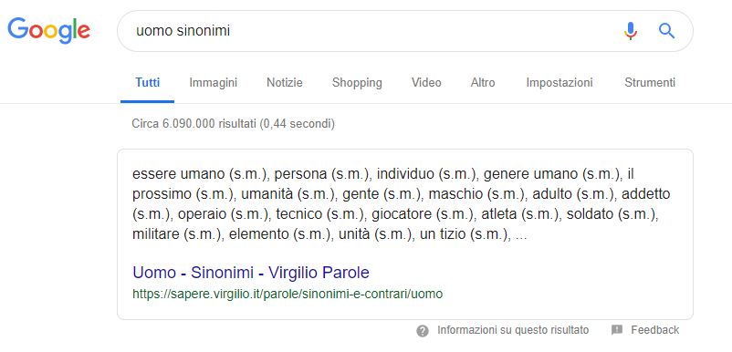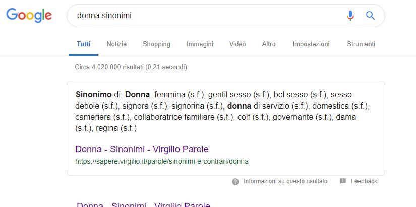 Ma c’è anche di peggio. Lo abbiamo scoperto casualmente oggi. Stavamo realizzando un articolo per illustrare le tante manifestazioni organizzate in Provincia di Lecco in occasione dell’8 marzo, la Giornata internazionale della donna. Per non essere ridondanti, e per utilizzare un linguaggio il più corretto possibile abbiamo cercato in rete, utilizzando il più noto dei motori di ricerca, Google, i sinonimi della parola “donna”. Quanto abbiamo scoperto ci ha lasciato quantomeno sbigottiti. Il primo risultato utile, quello messo in evidenza dal motore di ricerca, ovvero Virgilio Parole, “regala” delle “perle” che non ci siamo davvero sentiti di passare sotto silenzio.