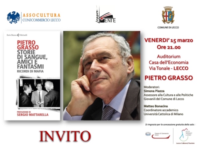 Venerdì 15 marzo alle 21 all’auditorium Casa dell’Economia della Camera di Commercio di Lecco è in programma un evento promosso dal Comune di Lecco e organizzato nell’ambito di Leggermente, la decima edizione della rassegna culturale di Assocultura Confcommercio Lecco. Pietro Grasso, ex Presidente del Senato e Magistrato, per anni in prima linea nella lotta alla mafia, sarà a Lecco per parlare del suo libro: “Storie di sangue, amici e fantasmi – Ricordi di mafia” a più di venticinque dalle stragi di Capaci e di via D’Amelio.