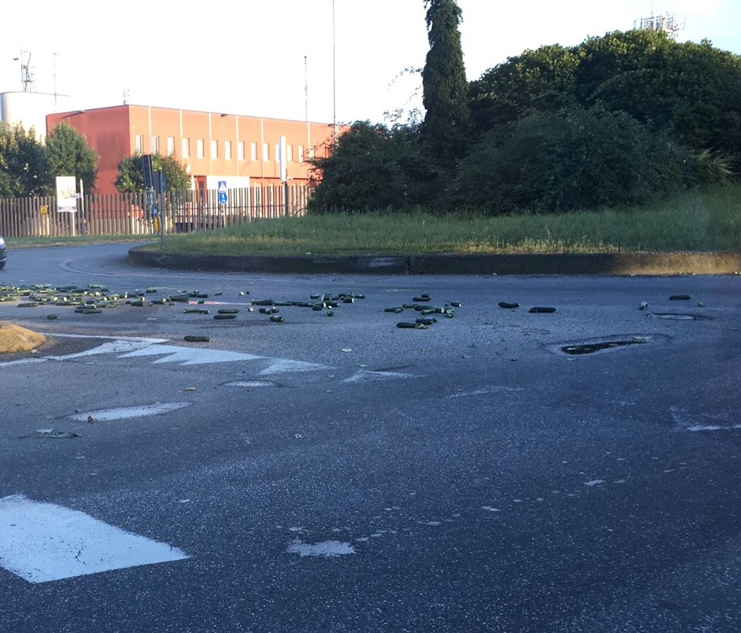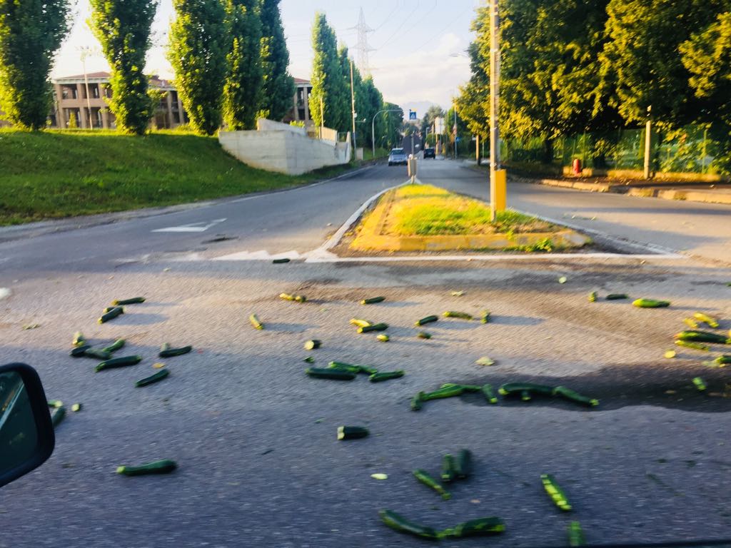 Un tappetto di zucchine verdi. Hanno strabuzzato gli occhi sorpresi, gli automobilisti che ieri sera intorno all’ora di cena si sono trovati a transitare lungo via Bergamo. Perché alla rotonda situata all’intersezione con via Turati e via Gramsci, all’altezza della caserma dei carabinieri, si sono trovati sotto i piedi, o meglio le ruote, un tappeto di zucchine. Evidentemente perse da un camion di passaggio che a giudicare dalla curvatura descritta dagli ortaggi a terra, deve aver ingaggiato la rotonda a velocità un po’ sostenuta.