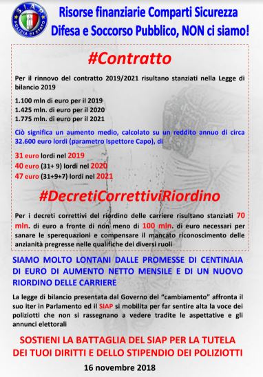 La Legge di Bilancio promossa dal Governo del “cambiamento” così com’è concepita ad oggi e viste le cifre che Circolano è fortemente deludente per i poliziotti e per tutti gli operatori dei comparti Sicurezza, Difesa e Soccorso Pubblico. Risorse finanziarie irrisorie per il rinnovo del contratto di lavoro, così come sono insufficienti per i decreti correttivi del riordino delle carriere: sperequazioni e mancati riconoscimenti delle anzianità pregresse nelle qualifiche di tutti i ruoli non possono essere sanati da una previsione di spesa di 70 milioni di euro a fronte degli almeno 100 milioni indispensabili.Ancora una volta le donne e gli uomini in divisa costretti a vedere vanificate aspettative? Ancora una volta siamo vittime di annunci e spot elettorali? Il SIAP non ci sta… Il giorno 16 novembre p.v. nella fascia oraria dalle ore 8,00 alle ore 13,00 davanti le Prefetture, le Questure e tutti gli Uffici periferici della Pubblica Sicurezza, gli uomini e le donne del SIAP, in presidi pacifici e organizzati, distribuiranno il volantino allegato con il quale si spiegano le ragioni della protesta e della battaglia per la tutela dei diritti reali dei Poliziotti: stipendio e riconoscimento professionale (carriera). Chiederemo attenzione e sensibilità perché la SICUREZZA è un bene comune e chi è preposto a garantirla DEVE essere tutelato: per il bene del Paese e della democrazia”.