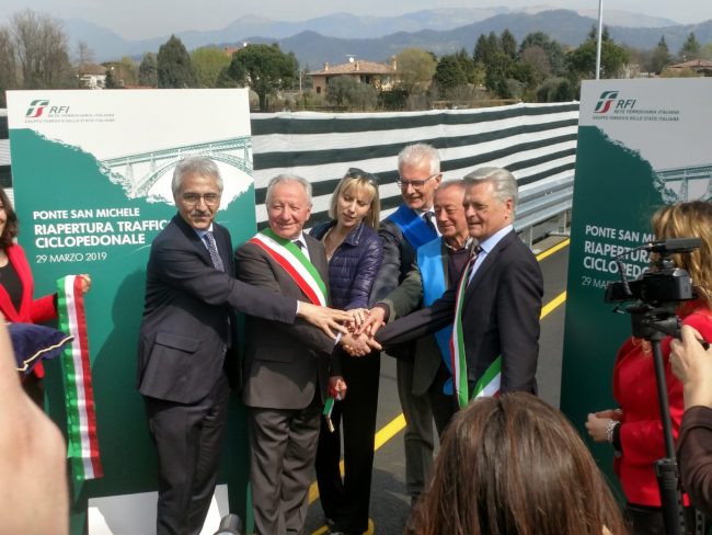 Vine tagliato nella mattinata di venerdì 29 marzo 2019, il nastro del riqualificato Ponte di Paderno che è stato riaperto per il transito di per pedoni e bici.
