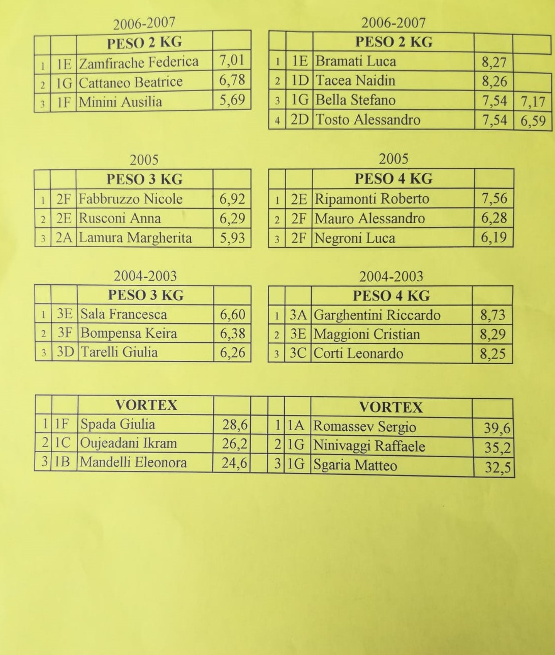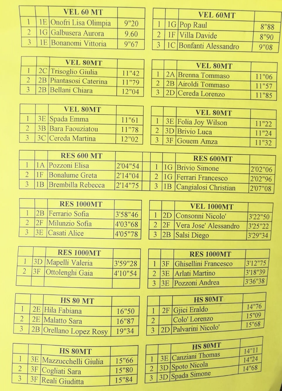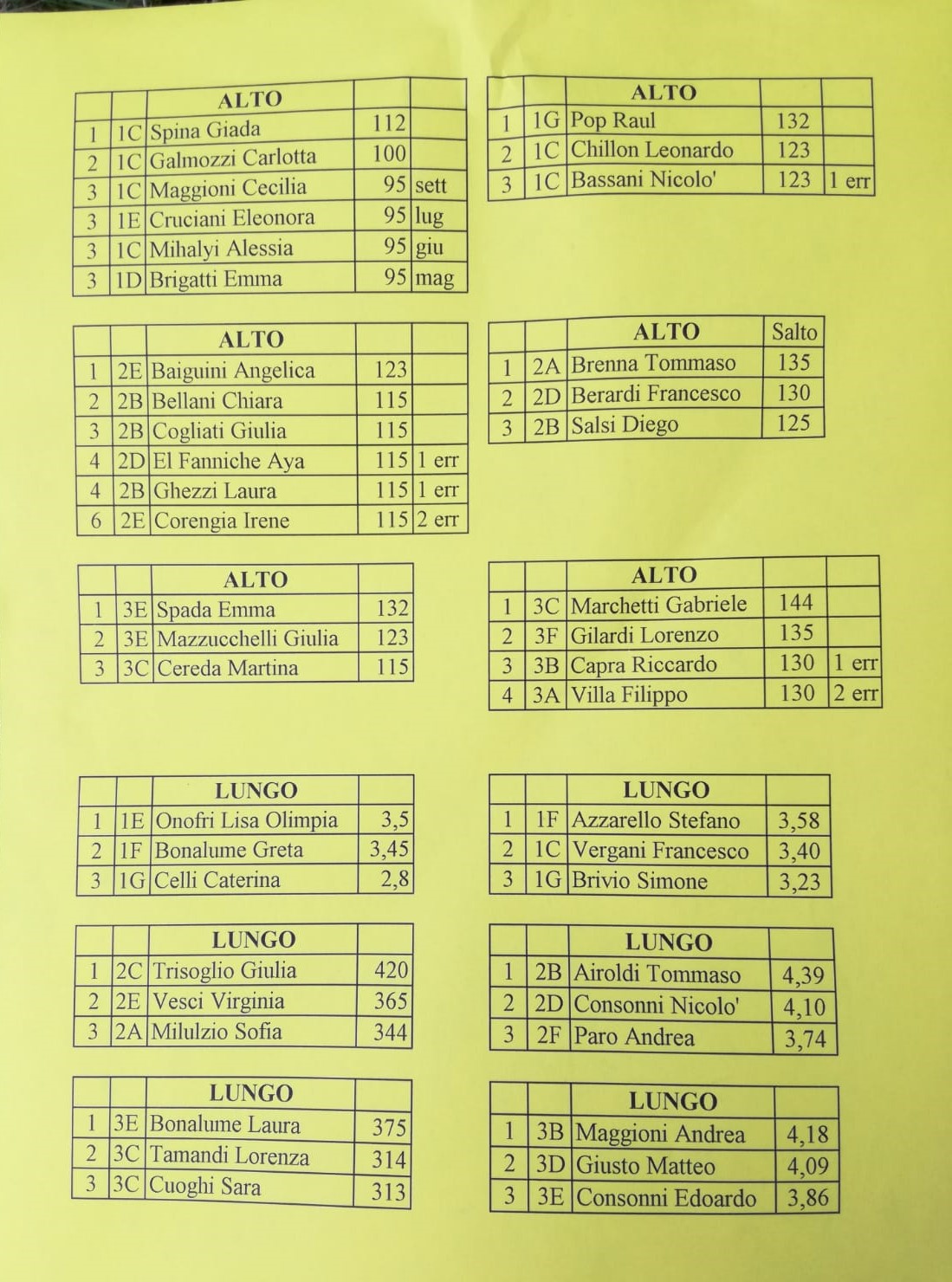 Ad inaugurare la festa sono stati i professori che tutti insieme hanno intonato davanti agli studenti “Vita spericolata” di Vasco Rossi. Quindi è stata la volta delle varie classi a cui si sono uniti anche alcuni genitori. Tra un canto e l’altro si è svolta la cerimonia di premiazione delle gare sportive di istituto con la partecipazione degli assessori Maria Silvia Sesana e John Patrick Tomalino. Per primi sono stati premiati i ragazzi che hanno partecipato alle gare di lancio del peso, poi quelli che si sono misurati nelle varie gare di velocità, e per concludere gli studenti che hanno partecipato alle gare di salto in alto e salto in lungo. Ecco di seguito le classifiche e le foto delle relative classifiche.