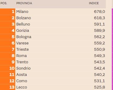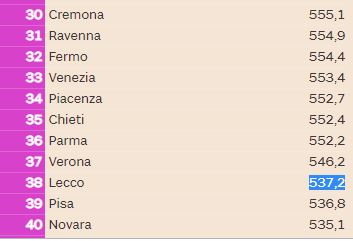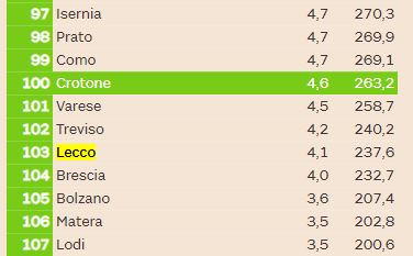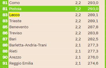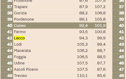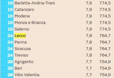 Questo 12esimo posto per non si “allontana” di molto da quel 15esimo che è stato assegnato alla nostra città da un altra classifica, quella realizzata poche settimane fa da Italia Oggi. Ma in quel caso secondo l’indagine realizzata in collaborazione con La Sapienza di Roma e Cattolica Assicurazioni Lecco era peggiorata, perdendo 10 posizioni