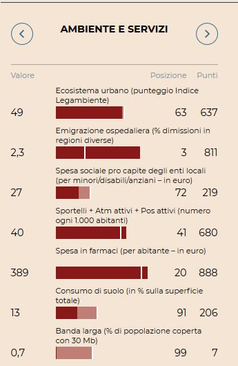 Ottimo risultato sul frote dell’emigrazione ospedaliera. Sono pochissimi i lecchesi che si fanno curare fuori provincia. Siamo invece al 99esimo posto per la banda larga. Non possiamo andare certo orgogliosi anche della posizione relativa al conumo del suolo: siamo solo 91esimi