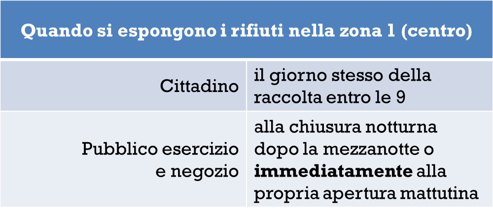 - Quindi cosa cambia per un cittadino e perché? La finalità è quella di rendere il centro cittadino più decoroso più a lungo, mantenendo sgombra da rifiuti la zona 1, che è quella maggiormente frequentata da cittadini e turisti nelle ore serali. Cambiano dunque solo gli orari di esposizione: non si possono più esporre i rifiuti la sera prima, dalle 19 a mezzanotte, ma c’è un periodo più lungo per esporli la mattina del giorno di raccolta, che va da mezzanotte fino alle 9.