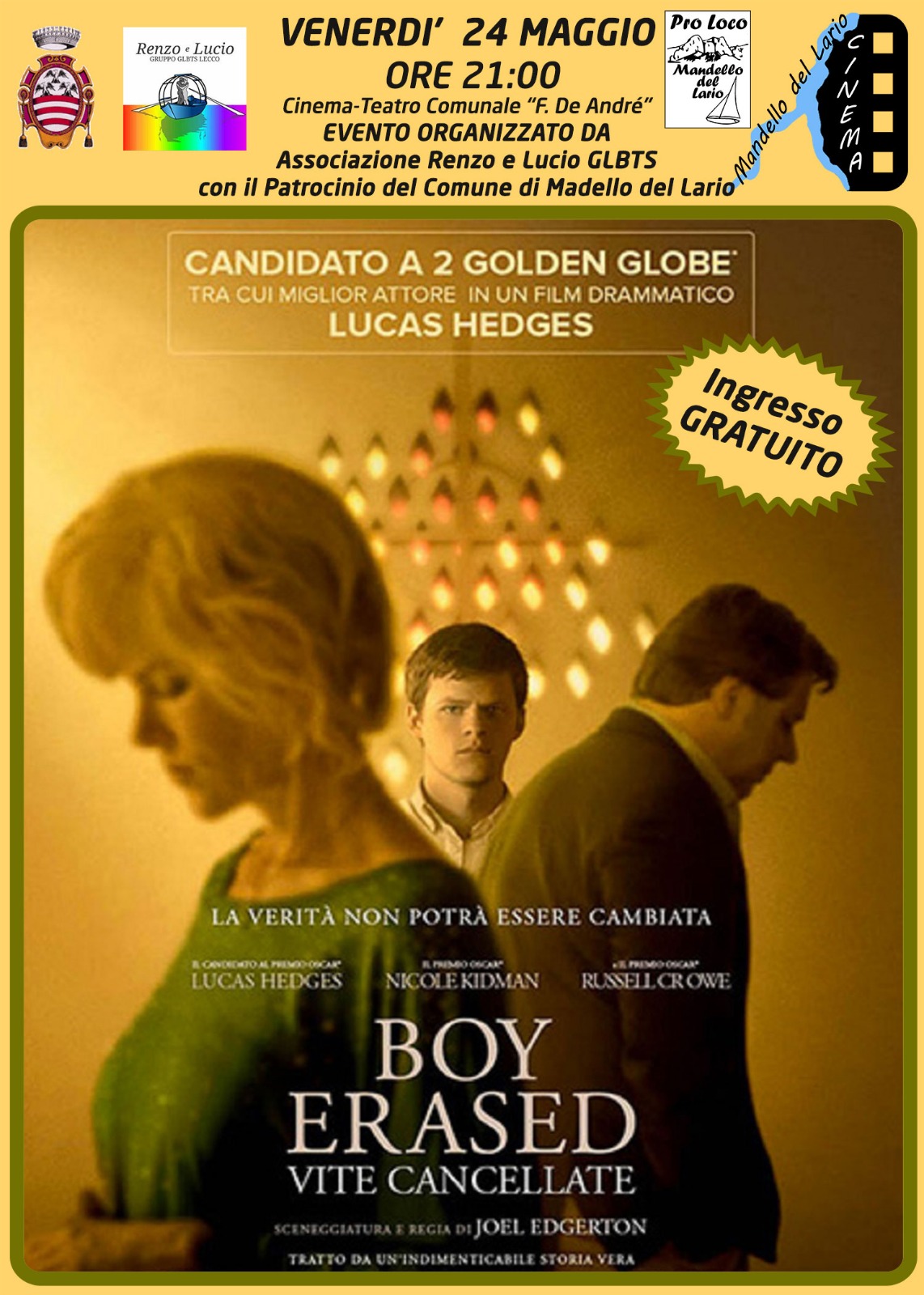 Venerdì 24 maggio al Cine Teatro De Andrè di Mandello proiezione del film “ Boy Erased: vite cancellate” in collaborazione con la Pro Loco e con il Patrocinio del Comune di Mandello. Un film che affronta il tema delle Teorie Riparative che pur essendo anti scientifiche vengono ancora riproposte in alcuni Paesi, Italia inclusa.