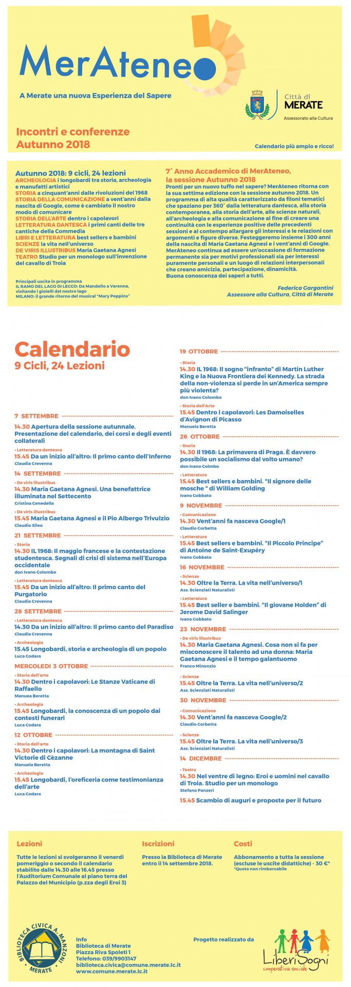 “Pronti per un nuovo tuffo nel sapere? MerAteneo ritorna con la sua settimana edizione con la sessione autunno 2018. Un programma di alta qualità caratterizzato da filoni tematici che spaziano per 360° dalla letteratura dantesca, alla storia contemporanea, alla storia dell’arte, alle scienze naturali, all’archeologia e alla comunicazione al fine di creare una continuità con le esperienze positive delle precedenti sessioni e al contempo allargare gli interessi e le relazioni con argomenti e figure diverse. Festeggeremo insieme i 300 anni della nascita di Maria Gaetana Agnesi e i vent’anni di Google. MerAteneo continua ad essere un’occasione di formazione permanente sia per motivi professionali sia per interessi puramente personali e un luogo di relazioni interpersonali che creano amicizia, partecipazione, dinamicità. Buona conoscenza dei saperi a tutti.” E’ così che descrive la nuova edizione di MerAteneo l’Assessore alla Cultura di Merate Federica Gargantini.