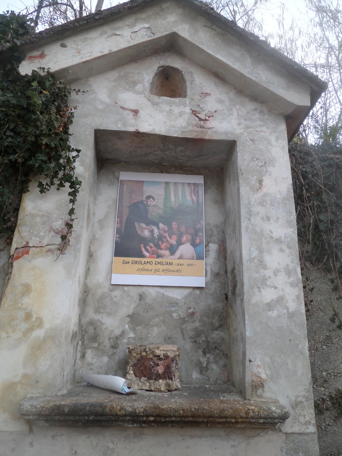 “Nel giugno del 2018 a Rossino nell’edicola di via Grigne veniva inqualificabilmente sfregiata una stampa di San Girolamo. Successivamente nel gennaio di quest’anno altri stupidi perditempo, o forse i medesimi, hanno scritto nello spazio vuoto alcune insensate scritte – spiegano i membri del gruppo Cambia Calolzio – Sabato, 8 febbraio, cogliendo la ricorrenza di San Girolamo, abbiamo riposizionato, a nostra cura, un’altra stampa di San Girolamo che distribuisce il pane ai poveri”.