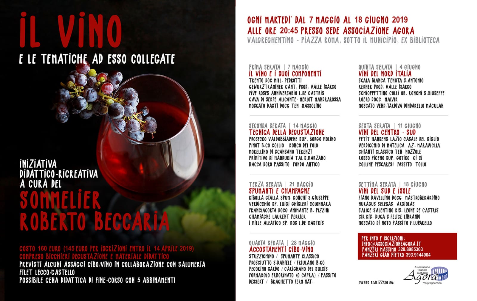 L’Associazione Agorà di Valgreghentino organizza un corso di degustazione vini: cinque prestigiose etichette di vino ogni serata per sette martedì.