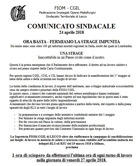 “La Rsu ha ritenuto di sposare l’iniziativa unitaria proposta dalla Fiom Cgil lecchese, portata avanti in primo luogo dal segretario Giuseppe Cantatore, in occasione delle assemblee che si stanno tenendo nell’azienda di via Santa Barbara” fabbo sapere dalla Cgil. “Si tratta di una protesta per fermare gli infortuni sul lavoro che stanno dilagando nelle fabbriche. Proprio per questo anche il Primo maggio sarà dedicato alla sicurezza sul lavoro”. Lo sciopero verrà effettuato l’ultima ora di ogni turno
