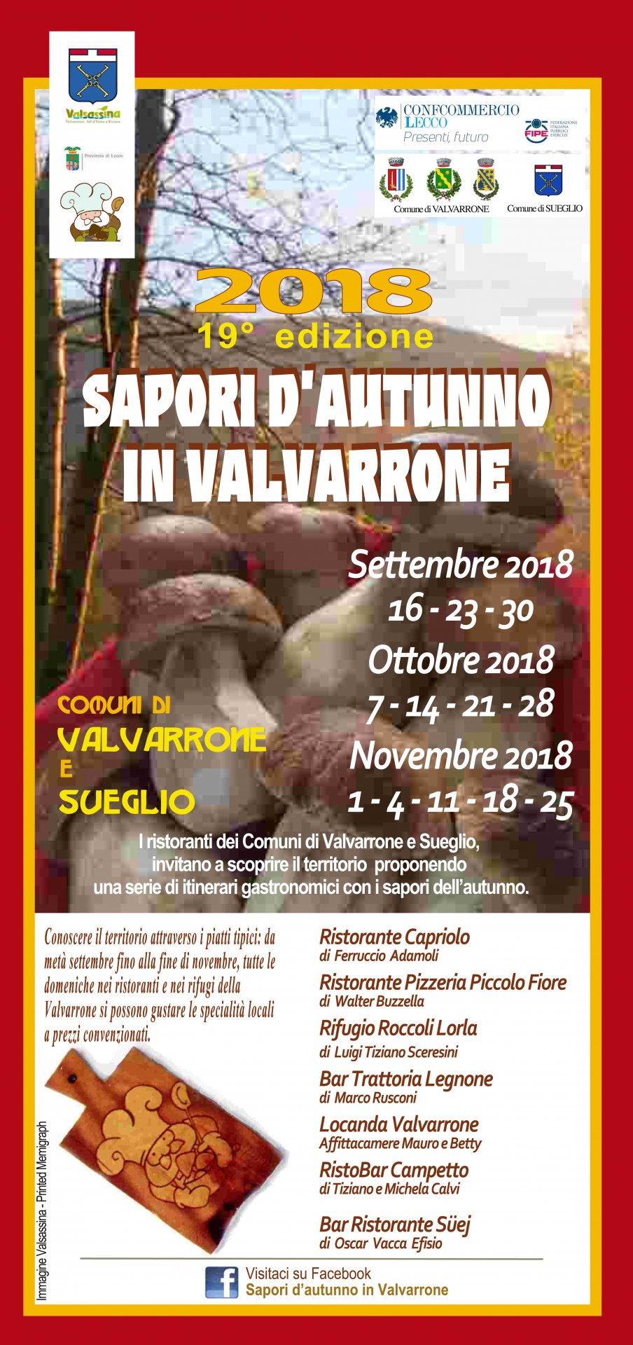 Il materiale pubblicitario è in distribuzione nei vari punti dei quattro comuni della Valvarrone, tre dei quali si stanno unendo anche amministrativamente e presso l’ufficio Turistico di Lecco, nelle varie amministrazioni coinvolte, presso la Comunità Montana di Barzio e la sede di Confcommercio a Lecco. Ulteriori informazioni sul profilo Facebook “Sapori d’autunno in Valvarrone”.