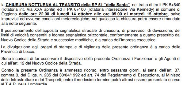 La Provincia di Lecco ha disposto la chiusura notturna al transito della strada provinciale 51 Oggiono dalle 22 di  oggi, lunedì 14 ottobre alle 5 di martedì 15 ottobre per occupazione totale della strada a causa di lavori di asfaltatura.