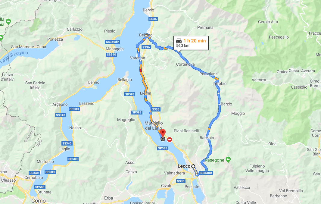 Lunghi incolonnamenti di auto intasano la Provinciale 72 sia in direzione sud che in direzione nord. Anche Google Maps dal satellite se n’è accorto e come itinerario per raggiungere Abbadia Lariana da Lecco, che distano circa 7 km, propone di passare per la Valsassina, rientrare sulla SP72 da Bellano e scendere di nuovo verso Abbadia. Un percorso di quasi 57 km che trasforma un tragitto di circa 7 minuti, in una giornata normale, in un viaggio di oltre un ora e venti.