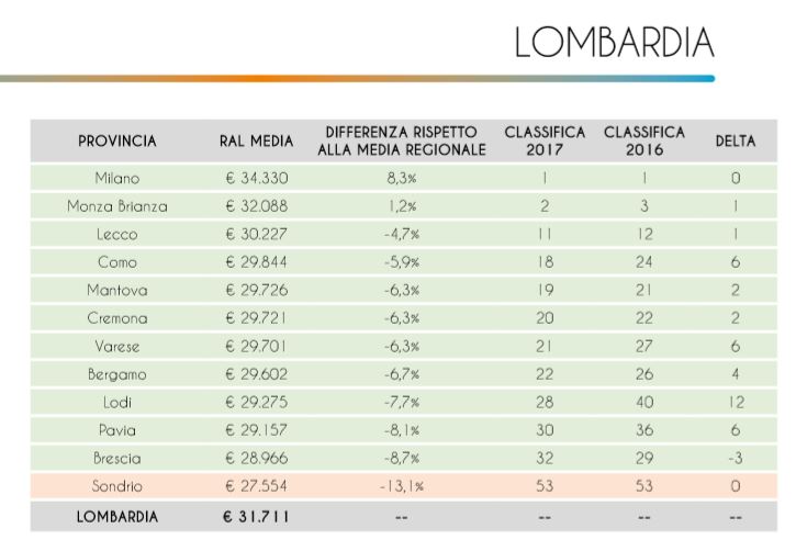 La nostra Provincia ottinene dei piazzamenti più che lusinghieri. Siamo 11esimi nella classifica assoluta e terzi in Lombardia. Regione che per altro è la migliore sul fronte degli stipendi.