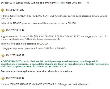 “Una attività manutentoria non é un accadimento imprevedibile ed un eventuale disguido avrebbe dovuto essere annunciato decisamente prima dell’orario di punta. Vien da chiedersi perché poi programmare questa attività a pochi giorni dalla chiusura di scuole ed aziende per le festività natalizie. I pendolari, ancora una volta coinvolti dai disagi, ci hanno parlato inoltre di autobus sostitutivi sovraffollati. Riteniamo intollerabile che, se fosse accertato, un piano del genere, RFI e Trenord ,oltre a non fornire un servizio adeguato, abbiano intenzione di mettere a rischio la sicurezza dei viaggiatori con soluzioni alternative improvvisate. Ancora una volta studenti, lavoratori ed aziende di Valtellina ed alto lago perdono ore di studio, lavoro e produttività senza ricevere alcun risarcimento. Riteniamo sarebbe ora di instaurare un sistema per cui chi sbaglia paga”.