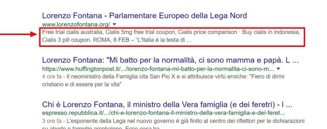Se siete appassionati di politica sicuramente lo avete fatto. Siete andati a cercare i nomi dei nuovi ministri su Google. Diversi di loro hanno un proprio sito internet personale. Compreso il ministro Lorenzo Fontana. Ma, cercando il suo nome sul motore di ricerca, quello in cui ci si imbatte non è certo quello che ci si aspetterebbe di trovare. Il sito www.lorenzofontana.org c’è e cliccandoci sopra sembra tutto a posto. Ma a lasciare perplessi è la metadescrizione del sito. Cioè quelle due righe che compaiono sulla pagina di ricerca sotto al nome del sito internet che servono a farci capire cosa più o meno troveremo all’interno del sito.