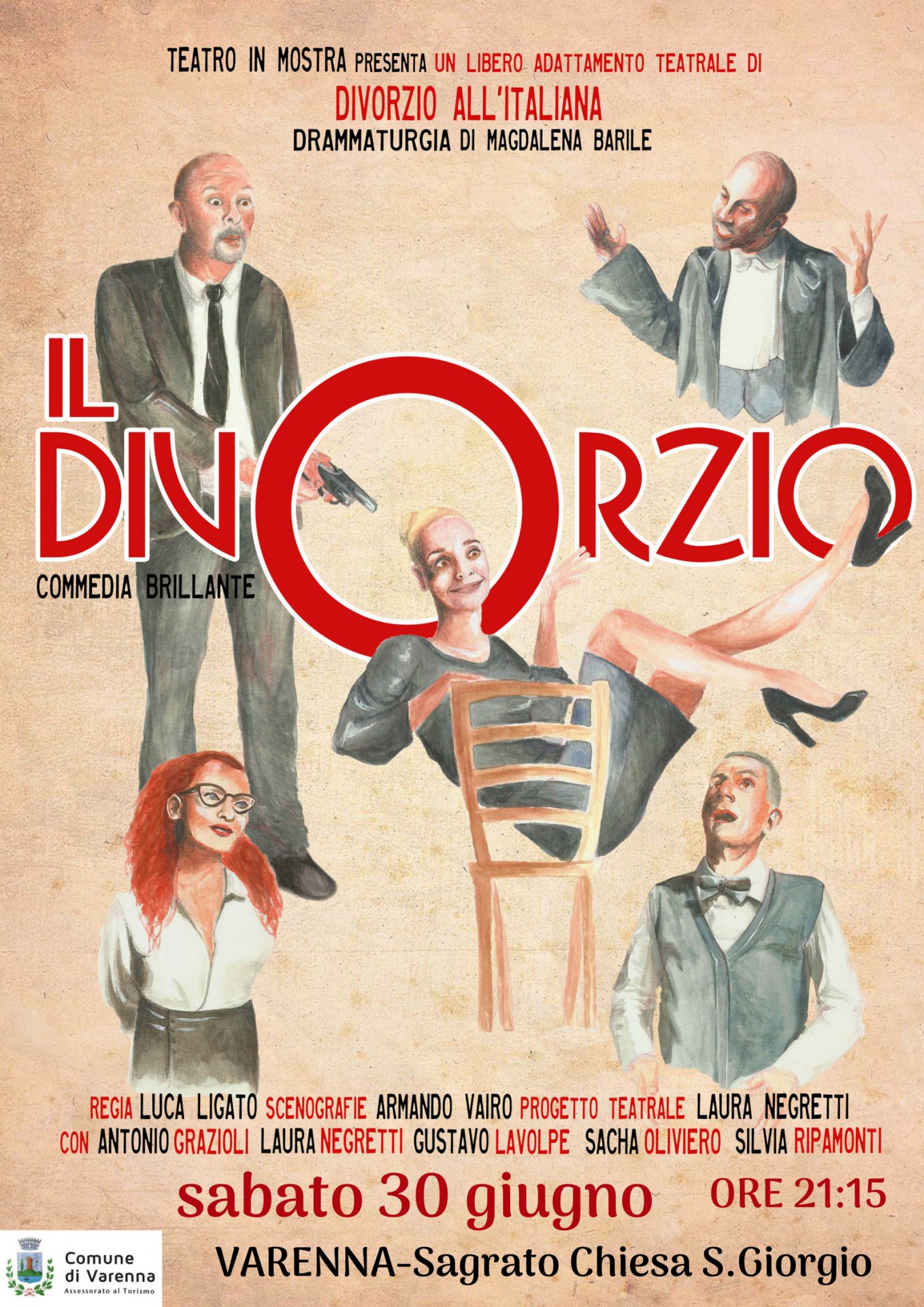 Lo spettacolo, che verrà rappresentato sabato 30 giugno alle 21:15 sul sagrato della chiesa prepositurale di S. Giorgio a Varenna, rende omaggio al notissimo film “Divorzio all’italiana” diretto nel 1961 da Pietro Germi, liberamente ispirato al romanzo “Delitto di onore” di Giovanni Arpino scritto nel 1960.
