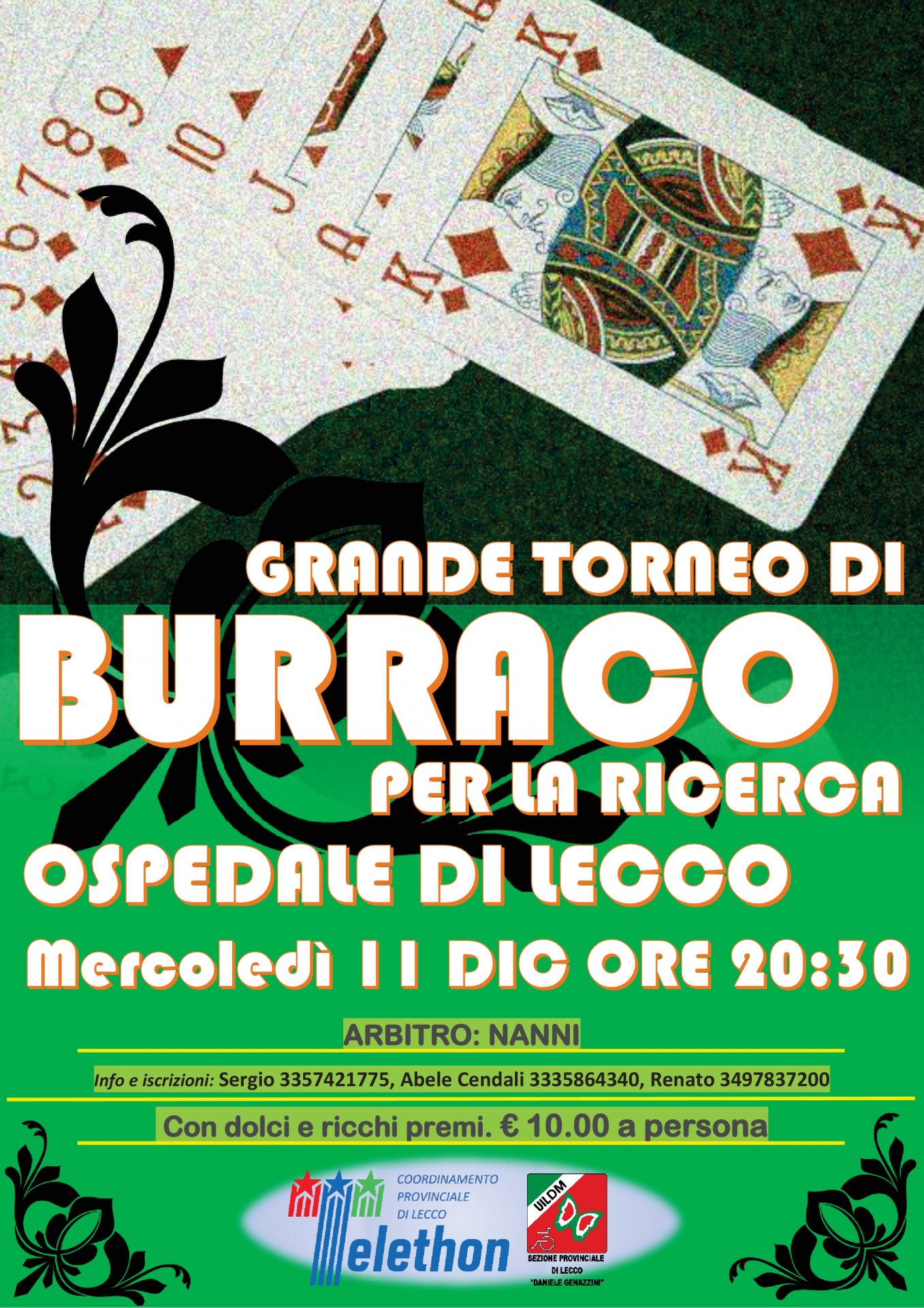 La prossima iniziativa da segnare sul calendario è il grande torneo di Burraco si terrà nella serata di mercoledì 11 dicembre 2019 alle 20.30 presso l’Ospedale di Lecco, Sono assicurati ricchi premi e Buffet dolci. Iscrizione 10 euro interamente devoluti alla ricerca