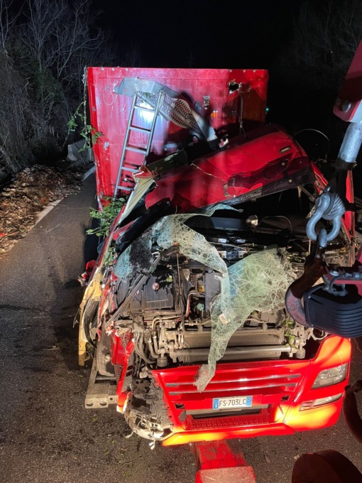 Dopo il recupero della salma dello sfortunato camionista, che con tutta probabilità è stato colpito da un colpo di sonno o ma un malore che gli ha fatto perdere il controllo del mezzo che ha sfondato il guard rail e poi si è ribaltato nel fossato, sono iniziate le lunghe e complesse operazioni per recuperare il grosso mezzo incidentato.