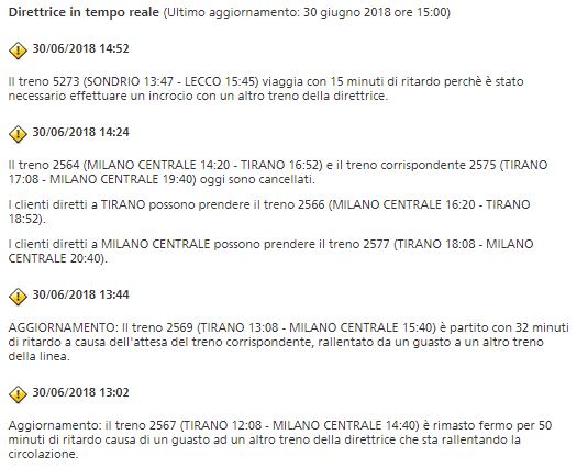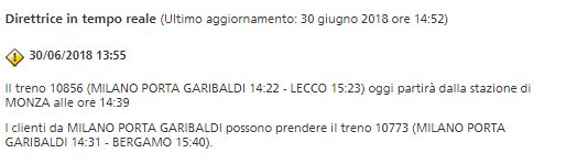 Il sito di Trenord informa che anche oggi, sabato 30 giugno, sulle linee Lecco-Carnate-Milano e Tirano-Sondrio-Lecco-Milano si registrano ritardi. Non solo rallentamenti, ma anche numerose cancellazioni a causa di un guasto di un treno. L’unica linea che non registra alcun ritardo è la Lecco-Molteno-Monza-Milano.