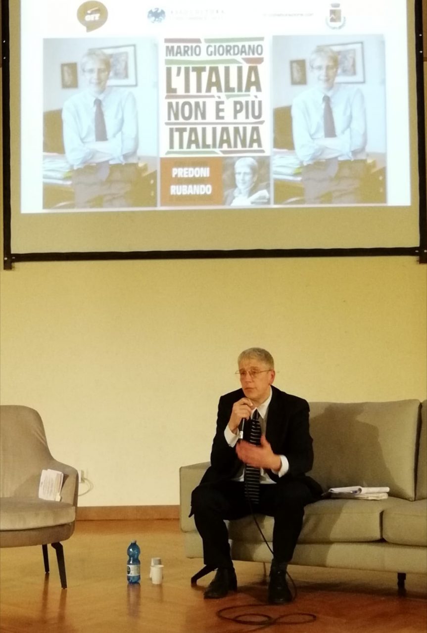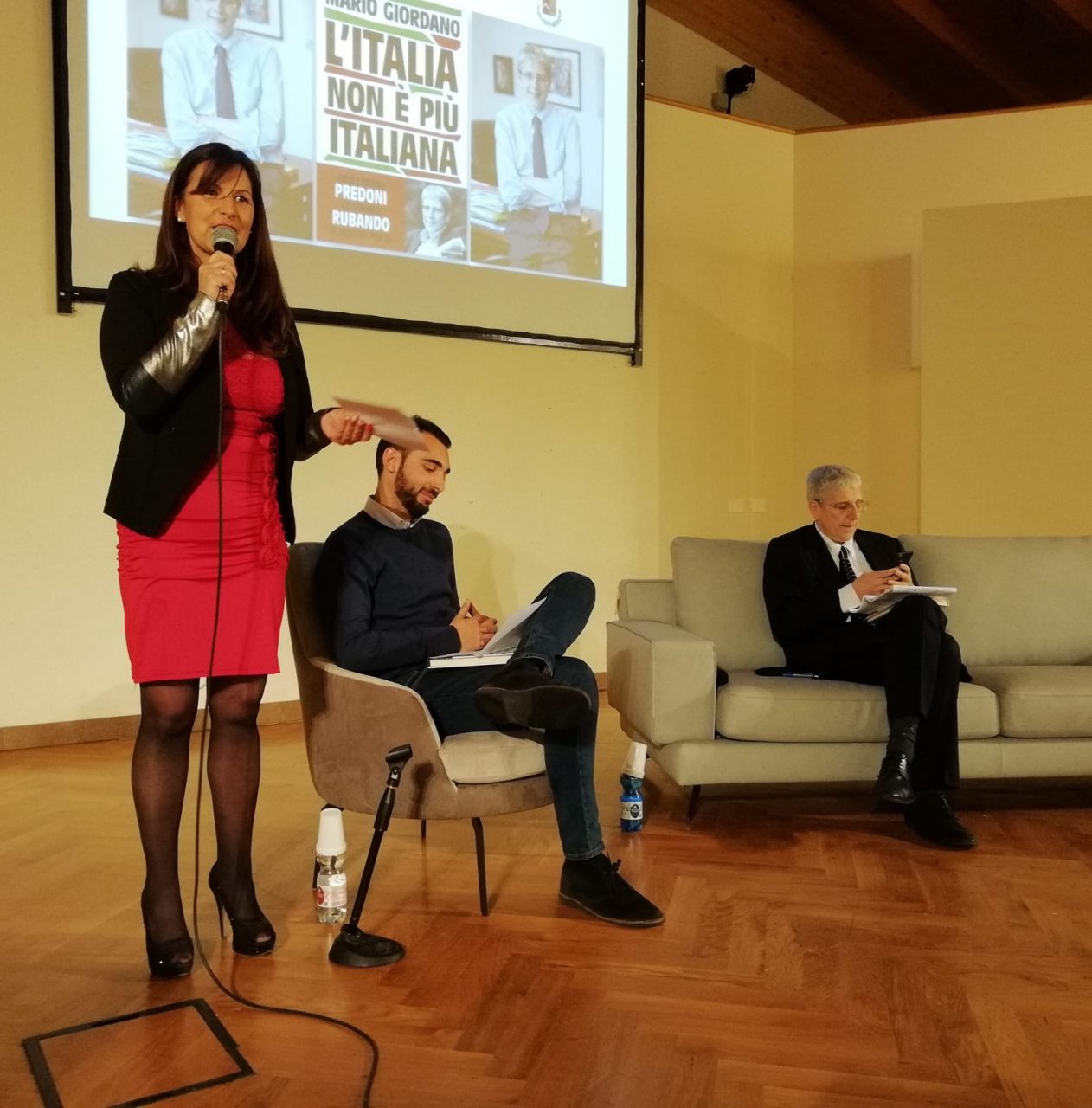 Nel corso della serata, Giordano ha ribadito e spiegando il contenuto del suo ultimo libro, sottolineando come si stiano estinguendo gli italiani anche perché ogni due giorni una nostra azienda passa in mani straniere. A questo si aggiungono anche le sempre più numerose fughe di italiani all’estero. Giordano ha ribadito anche come le decisioni economiche, strategiche e soprattutto quelle sul futuro nostro e dei nostri figli vengano prese dall’altra parte del mondo, in Cina o in America, da persone o meglio personaggi che non hanno mai gestito una fabbrica o che non hanno mai avuto una relazione con la nostra cultura, la nostra terra e la nostra storia. “Tutto ciò è un allarme per noi ed un dolore rimasto inascoltato, che tutti invece dovrebbero ascoltare… Non meravigliamoci, poiché, potremmo risvegliarci un mattino in un Italia che non c è più” ha chiosato Giordano. Nel corso della serata poi sono state posti all’ospite speciale numerosi quesiti di carattere sociale, di giustizia, e soprattutto sul futuro dell’Europa.