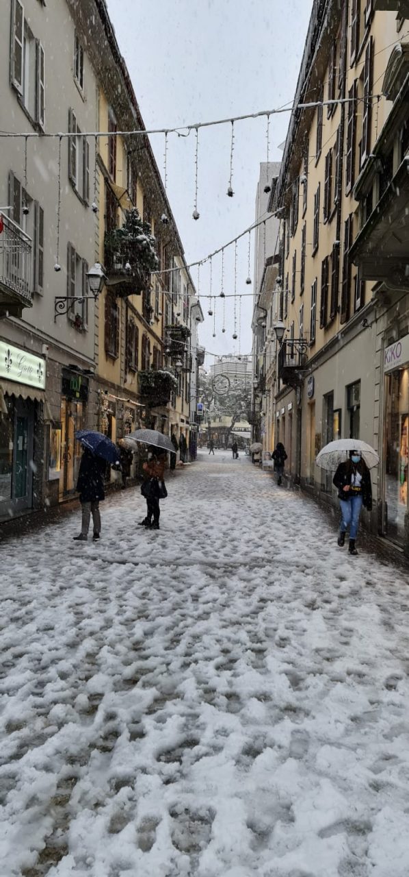 Le vie del centro completamente imbiancate. Persone che passeggiano incappucciate, con guanti e sciape, ma non solo. Pupazzi di neve occupano i tavoli dei bar che, purtroppo, anche in questa nuova zona arancione non potranno essere vissuti dai lecchesi. Questo risveglio imbiancato, però, rende l’atmosfera perfetta per le feste e segna l’inizio dell’inverno.