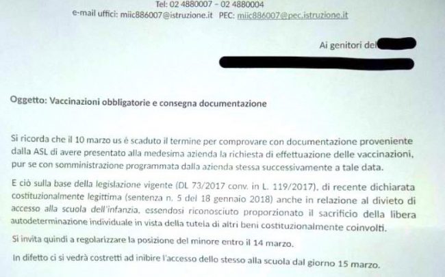 Ma la dirigente non ci sta: “Non ho scelto io, mi sono semplicemente attenuta alle disposizioni di Ats che ha anche inviato le lettere da mandare ai genitori, quindi nessuna scelta in autonomia e tanto meno minaccia. Purtroppo le normative e le circolari che vengono inviate spesso non sono precise: ci vorrebbe maggior chiarezza. Ma mai ho agito per mia volontà senza seguire le disposizioni degli enti competenti”.
