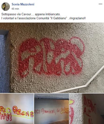 I soliti ignoti, o per meglio dire idioti, armati di bombolette spray sono entrati in azione deturpando il sottopassaggio di via Cavour che era stato da poco rimesso a nuovo dai migranti dell’associazione Il Gabbiano e dai volontari della Protezione Civile. Un atto stupido e incivile, un danno per la collettività e anche una mancanza di rispetto nei confronti dell’Amministrazione comunale e dei giovani scesi in campo per rendere il paese più pulito e piacevole.