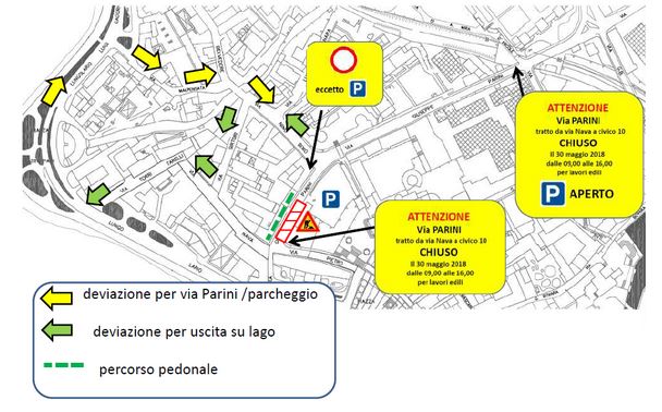 Per consentire l’esecuzione dei lavori di demolizione dei due fabbricati di proprietà comunale ubicati all’altezza dei civici 6 e 10 di via Parini,oggi la direttrice, nel tratto compreso tra l’intersezione con via Nava e il civico 10, resterà chiusa al traffico veicolare e al transito dei pedoni fino alle ore 19.00. Sarà tuttavia garantito un percorso pedonale lungo il lato sinistro della via per i residenti e per l’accesso ai pubblici esercizi. Durante il periodo di chiusura sarà comunque garantito l’utilizzo del parcheggio pubblico di via Parini, che resterà raggiungibile da via Nino Bixio e dalla parte alta di via Parini; il traffico proveniente dal lungolago e diretto in via Parini sarà deviato sulle vie Malpensata e Bixio, mente i veicoli in uscita dal parcheggio a pagamento di via Nava, potranno raggiungere il lungolago passando da via Torri Tarelli.