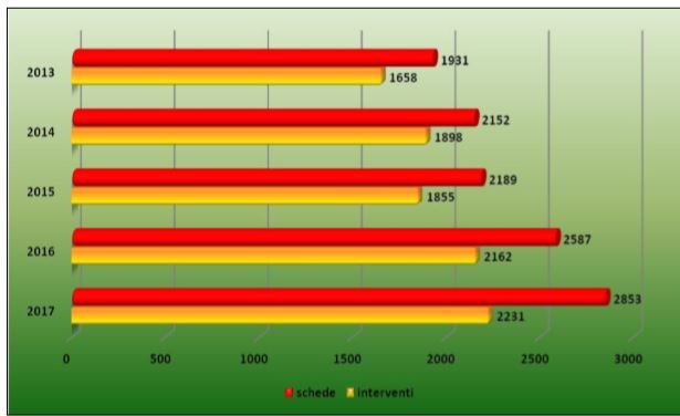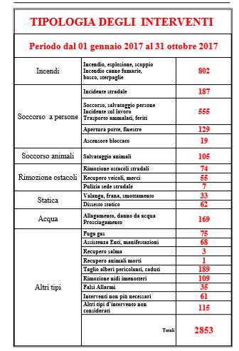 Il Comando Vigili del Fuoco di Lecco nel periodo dal 01 gennaio 2017 al 31 ottobre 2017 ha effettuato 2231 interventi per soccorso tecnico urgente che hanno richiesto la compilazione di nr. 2853 schede d’intervento.