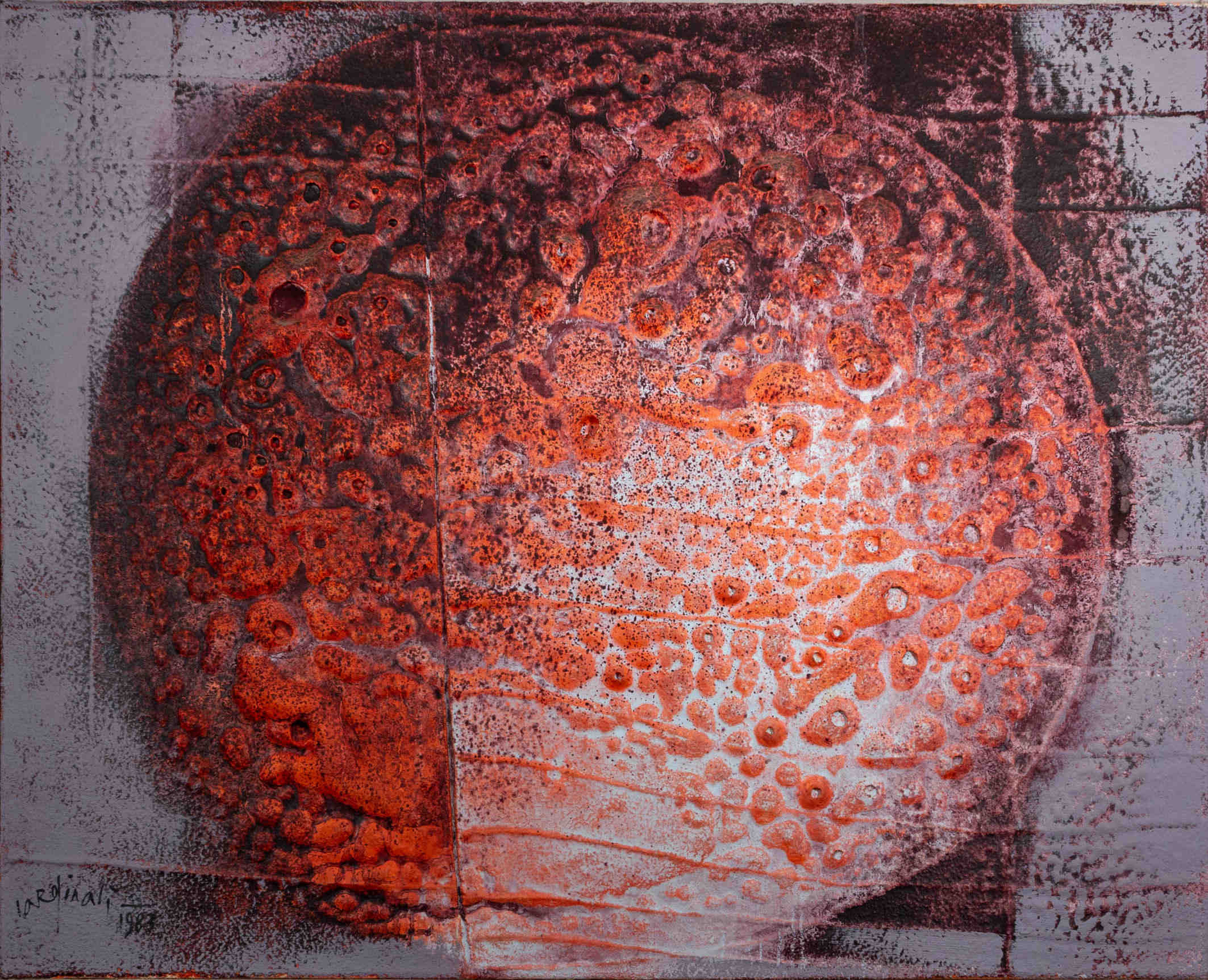 È lì che le superfici si fanno spesse, composite e vissute, trattate con interventi profondi, lacerature o crateri, immaginando che sul “corpo” della pittura si possano scatenare gli elementi: il fuoco possa incenerire come per Fleur incinérée del 1968, l’acqua possa dilavare come in Linge sale pour laver en familie dell’82, l’aria possa sollevare nuvole di polvere iridescente come in Site cosmique aux reflets d’aurore dell’83. «Le sue tele – prosegue Resch – scavano oltre la dimensione del visibile, con profonde ferite che sembrano trapassare la superficie, come i tagli di Fontana; la materia densa con cui inizia a lavorare a partire dalla fine degli anni ’60, che poi subito diventerà sabbia trattata con caseina e pigmenti, passa da uno stato inerte a uno attivo, sperimentale, con combustioni (che, differenza di Burri, sono “riprodotte” con la pittura), essiccazioni, mute di epidermide, impronte. L’opera si fa organismo vivente e diventa partecipe del mistero di un cosmo sempre più complesso».