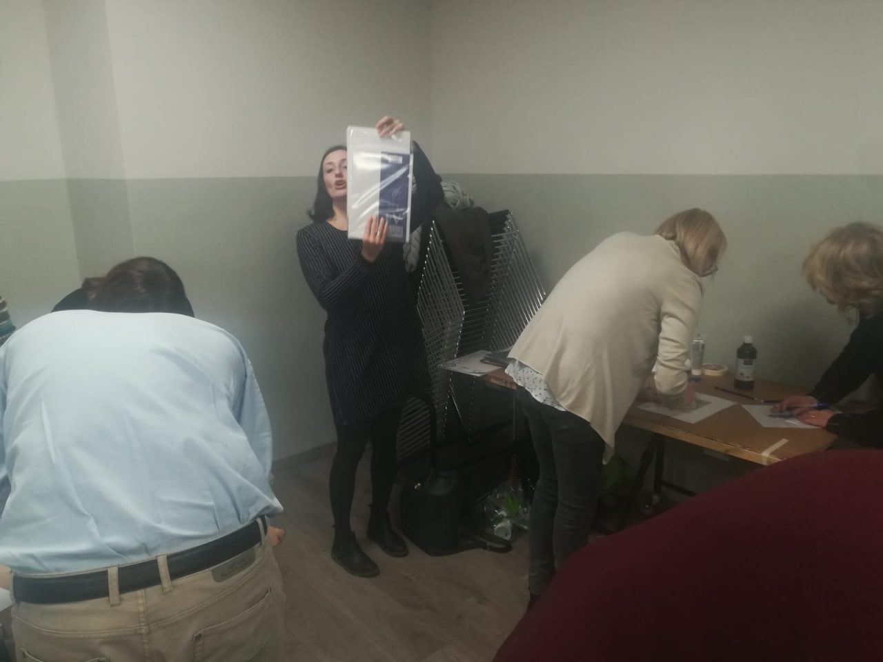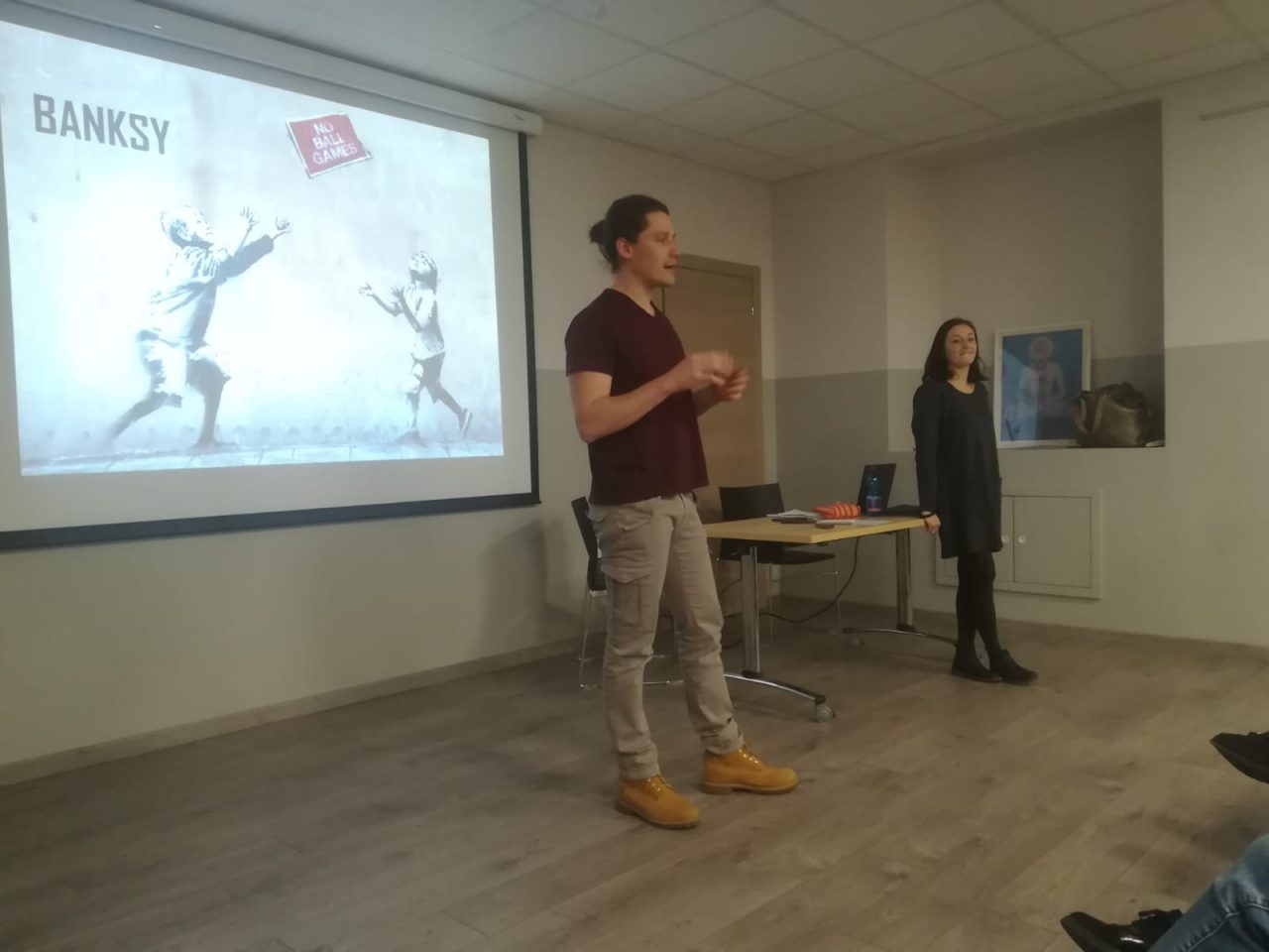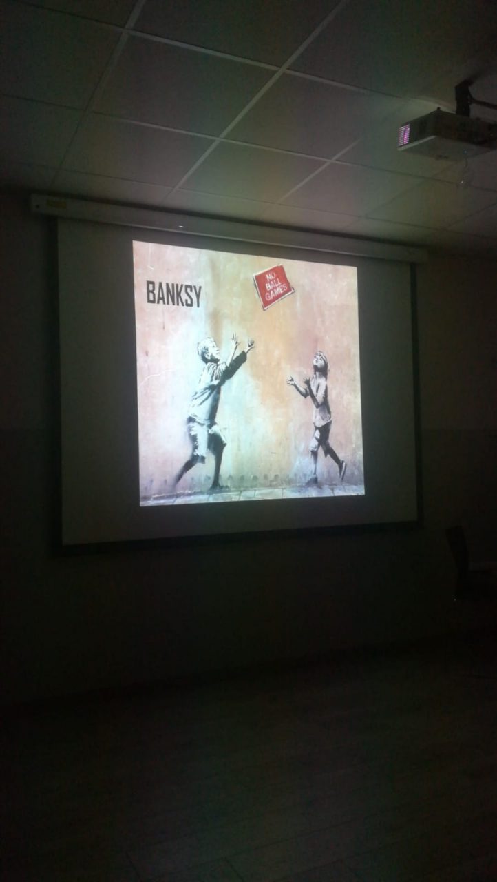 L’argomento era la poetica di Banksy, un street artist attualmente in attività che difende gelosamente il suo anonimato. Per illustrare la tecnica utilizzata dall’artista per realizzare la maggior parte delle sue opere pittoriche, lo stencil, la relatrice Simona Castelli ha guidato i numerosi convenuti nella realizzazione di “opere d’arte”. Armati di taglierini, fogli di acetato, spugne, inchiostro e tanto entusiasmo, in poco tempo i partecipanti al corso hanno prodotto decine di immagini. Al termine del “laboratorio”, che aveva lo scopo di dimostrare come Banksy possa realizzare opere importanti in tempi ridottissimi, Simona Castelli ha illustrato la figura dell’ artista e la maniera con cui le sue opere esprimono il suo impegno di attivista politico con interessi nel sociale, nella difesa dell’ ambiente nella denuncia sulle atrocità della guerra.