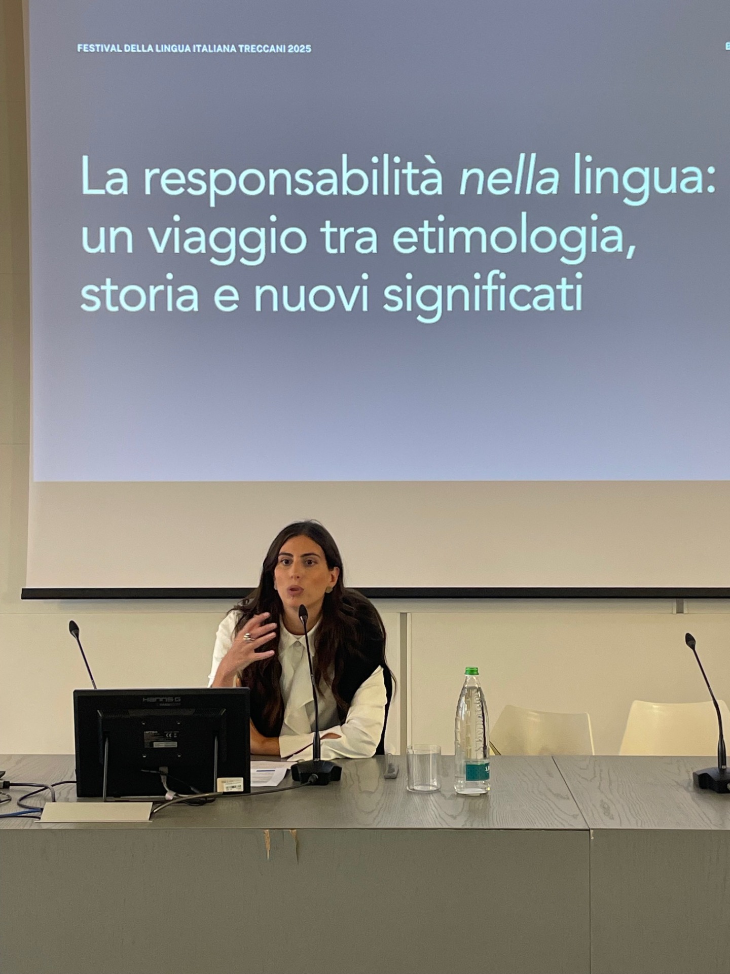 Beatrice Cristalli, formatrice e linguista, collaboratrice di testate come Focus Scuola e Treccani.it ed esperta dell’evoluzione dei linguaggi contemporanei, ha proposto “La responsabilità nella lingua: un viaggio tra etimologia, storia e nuovi significati”. Partendo dal significato etimologico di responsabilità — rispondere, assumere un impegno — ha seguito l’evoluzione del termine, esplorandone dapprima le connessioni con il linguaggio “della norma” per poi approdare alle riflessioni del linguista Langshaw Austin, per il quale “le parole hanno un potere generativo, sono atti linguistici e fanno quindi accadere cose”. In quest’ottica, il termine responsabilità suggerisce una dimensione attiva, in cui promettere significa assumersi un impegno. È quel “farsi carico” che segna la riflessione di Manuel Cruz, secondo cui “responsabilità è un ponte tra memoria e progetto, tra passato e futuro e per questo ha a che fare con l’identità. Essere responsabili è non lasciare la propria vita in mano ad altri”. La responsabilità, talvolta intesa come colpa, porta invece a un’azione paralizzante, poiché la colpa riguarda il passato, qualcosa di già compiuto. “La responsabilità in azione si determina nel qui e ora. Riguarda il nostro stare in relazione ed è quindi una parola sociale.”